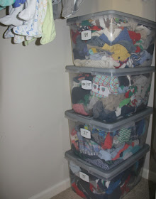I repurposed some Rubbermaid tubs from another room, and used dry-erase labels to identify the clothing size for each tub. It's a pretty simple system, but it's just about finding the time to get started.